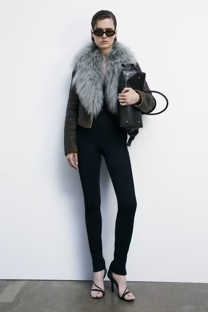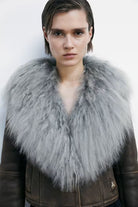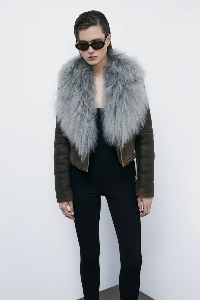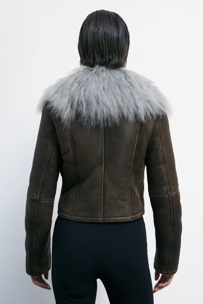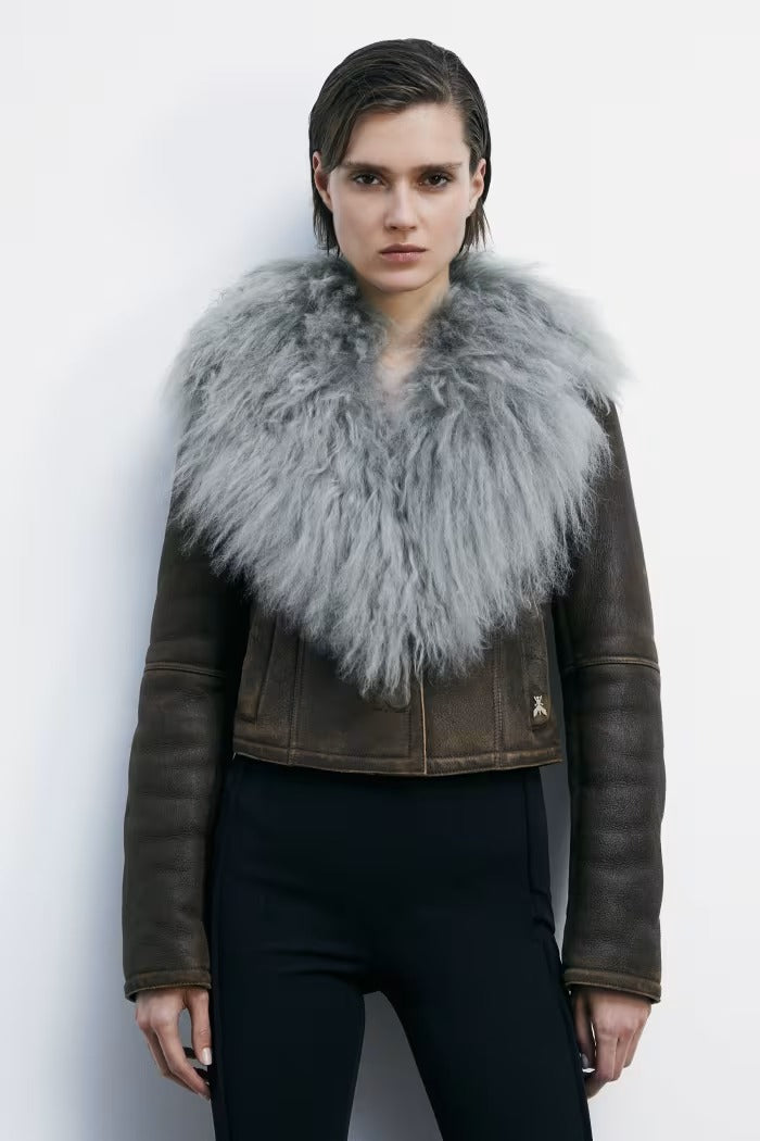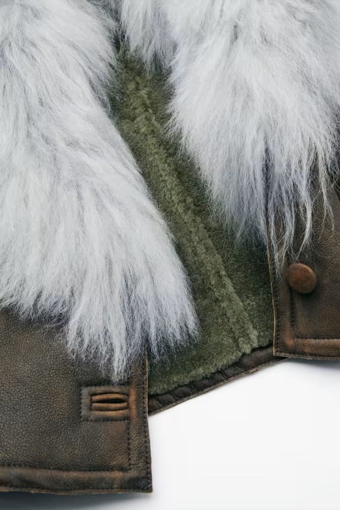 Piel de oveja con efecto napa, cuello de pelo rizado y voluminoso.