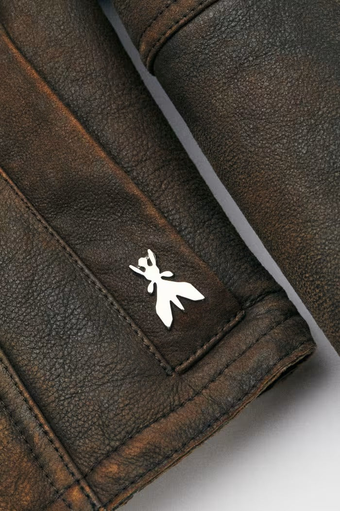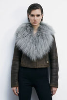 Chaqueta PATRIZIA PEPE de piel de oveja con efecto napa y solapa abierta de pelo rizado y voluminoso. Los detalles artesanales —costuras con acabado desgastado, trabajo en passe-grain, botón forrado y etiqueta de cuero en la espalda— subrayan su exclusividad.