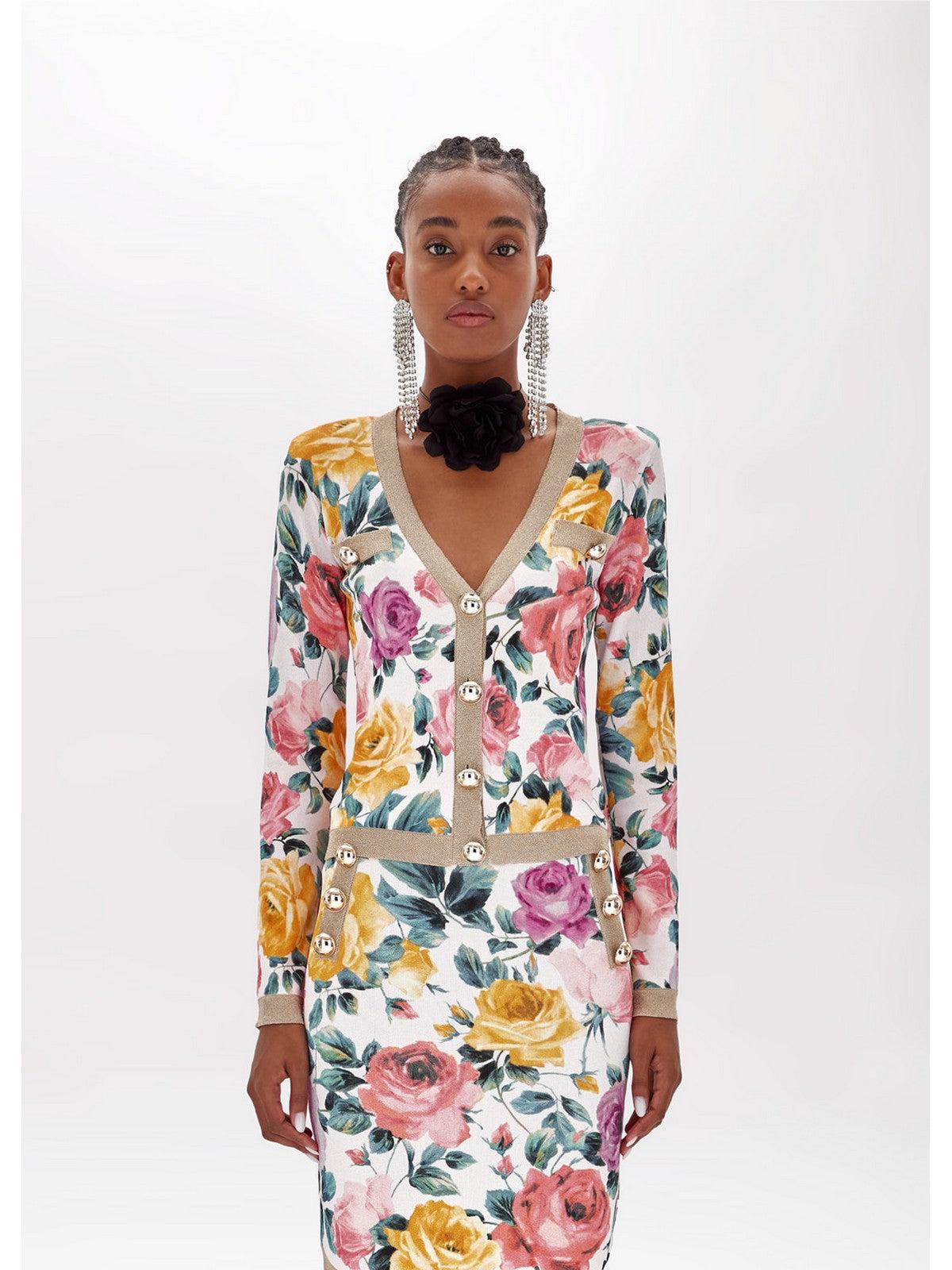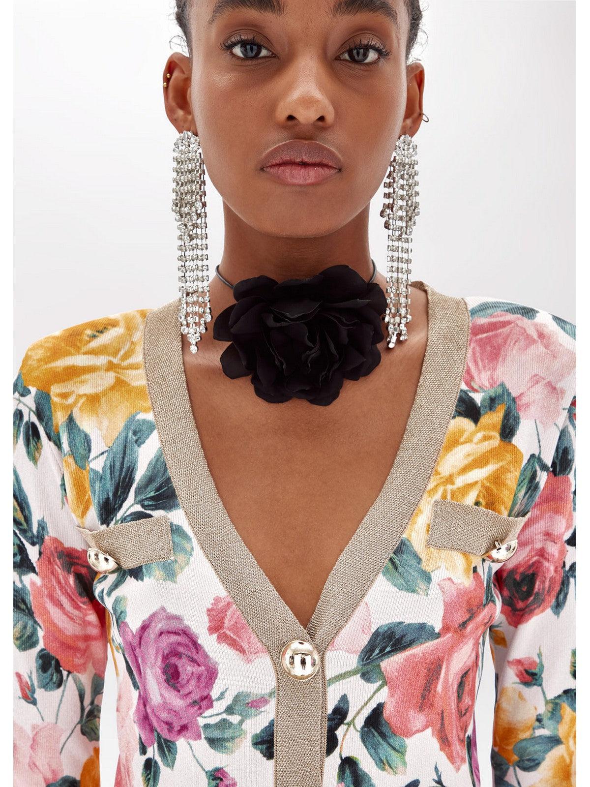 Cárdigan BLUGIRL de crepé de viscosa. Estampado floral integral con ribete de lúrex liso. Cuello de pico y manga larga. Cierre con botones dorados de media esfera. Corte ajustado.