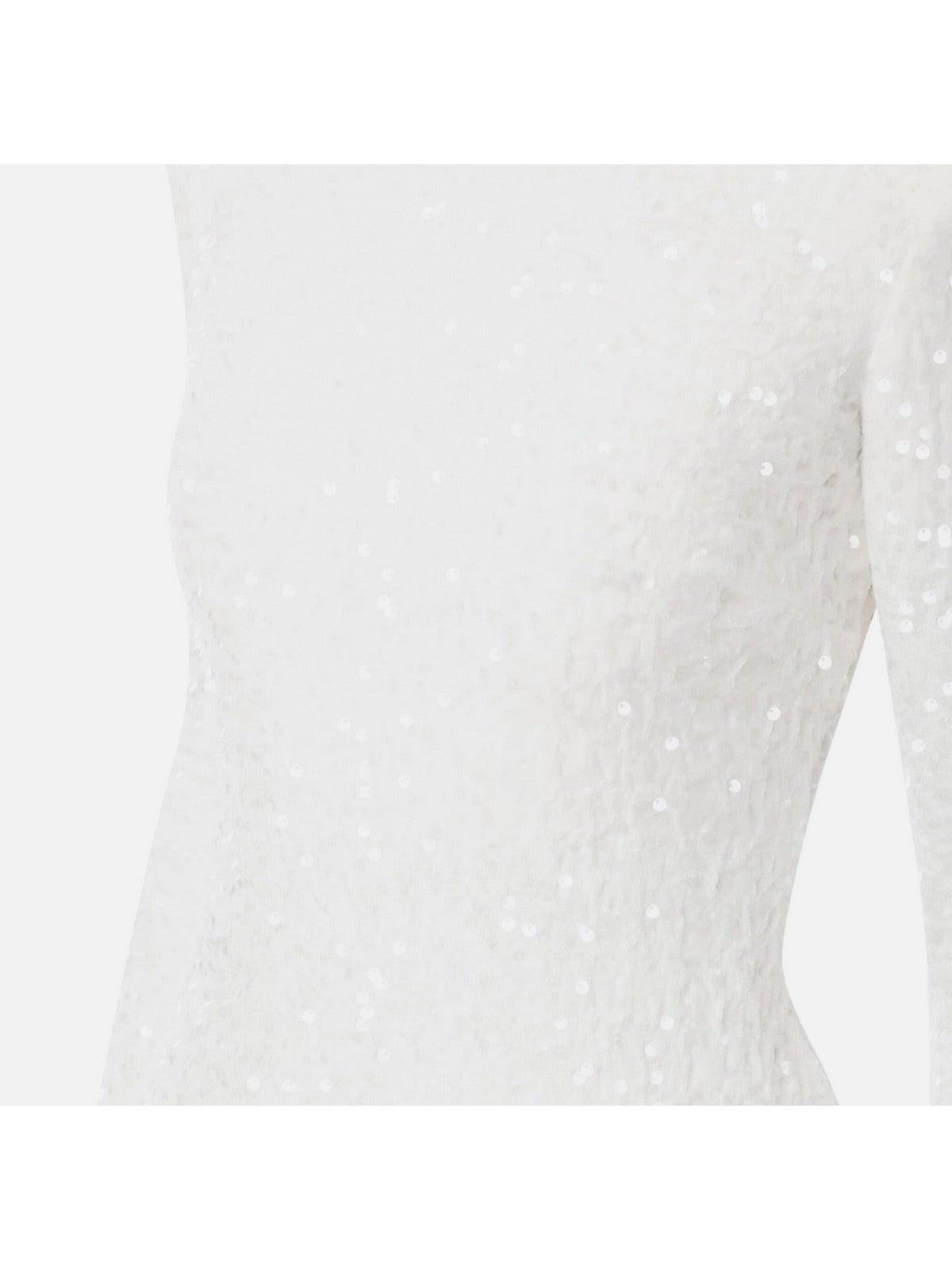 Vestido de chenilla de ELISABETTA FRANCHI bordado con lentejuelas. Cuello alto y mangas largas con hombreras. Un gran ojo de buey en la espalda deja la espalda al descubierto.