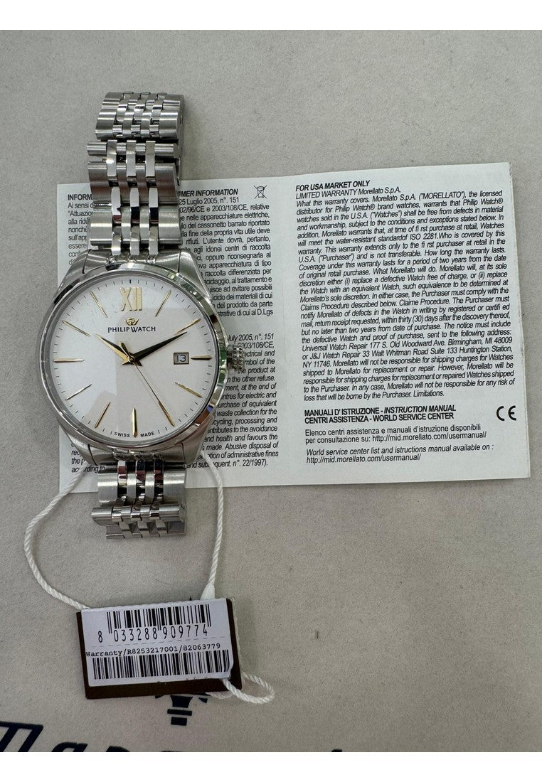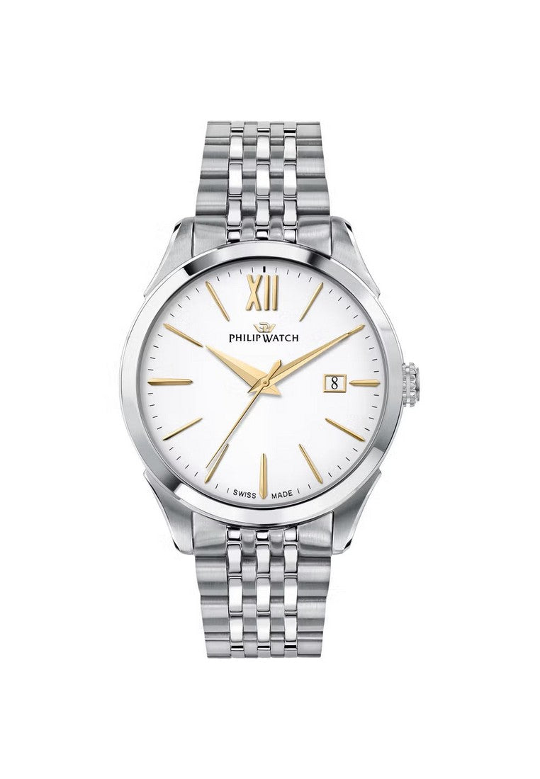 Realza tu estilo con el reloj para hombre de la colección Roma de Philip Watch. Con un diseño elegante y versátil, este reloj es perfecto para cualquier ocasión. La caja de acero inoxidable de 41 mm ofrece una presencia refinada en la muñeca. La esfera blanca con detalles refinados crea un contraste sofisticado. La correa de metal plateada completa el look con clase. Gracias al tratamiento del cristal de zafiro, la esfera permanece protegida de arañazos indeseados con el paso del tiempo. Con una resistencia al agua de 5 ATM, puedes usar este reloj en tus actividades diarias sin preocupaciones. El cierre de mariposa con pulsadores garantiza un cierre seguro y cómodo. Con la garantía oficial de 2 años de Philip Watch, puedes disfrutar de la calidad y fiabilidad de este reloj. Compra el reloj para hombre de la colección Roma de Philip Watch y añade un toque de sofisticación a tu estilo.
